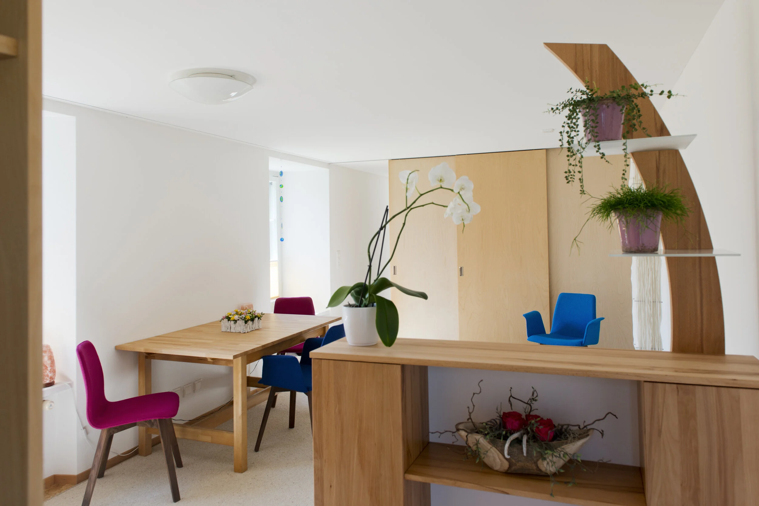Die Kundin wollte ihre Praxis neu gestalten. Im Prozess fanden wir heraus, dass sie keine Farben benötigt sondern ein multifunktionales Möbel, welches sie als Raumtrenner, Sekretär, Empfangstheke, Pflanzenhalter und ein Stauraum für Ihr Büro benötigt.