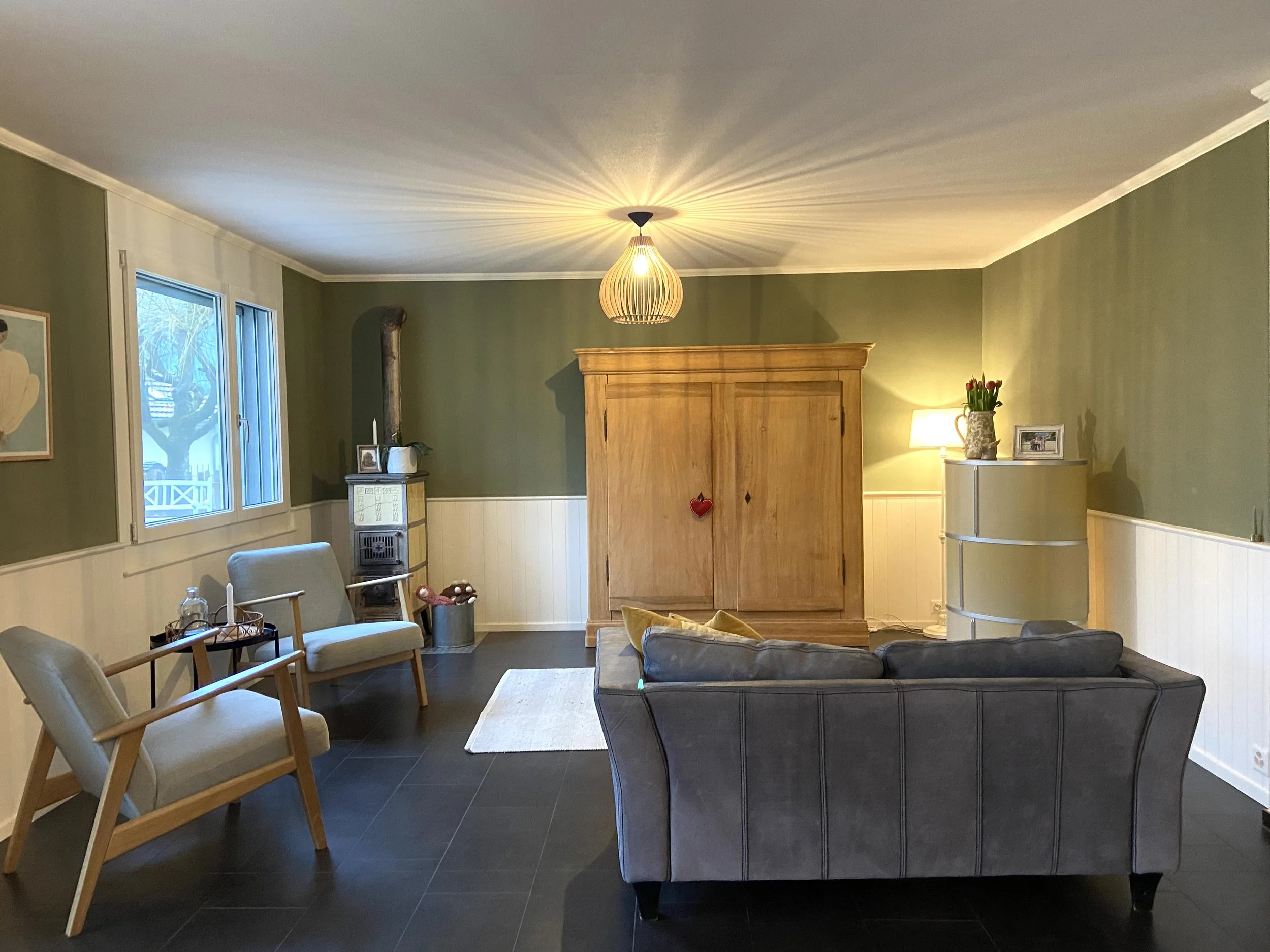 Materialien Die neue Täferbrüstung ist mit Natutharzfarbe bearbeitet. Durch die Zierleisten entsteht ein vielschichtig abgerundetes Ambiente. Die Wände sind mit Lehm verputzt um dem Raum noch mehr Geborgenheit zu geben. Parterrebereiche sind immer etwas dunkler, deshalb haben wir die Decke mit Kalkfarbe gestrichen, weil ihr kristalliner Charakter den Raum öffnet.